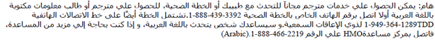IMPORTANT: You can get an interpreter at no cost to talk to your doctor or health plan. To get an interpreter or to ask about written information in (your language), first call your health plan’s phone number at 1-888-439-3392. The plan also has a TDD line 1-949-364-1289 for the hearing impaired. Someone who speaks (your language) can help you. If you need more help, call the HMO Help Center at 1-888-466-2219.
